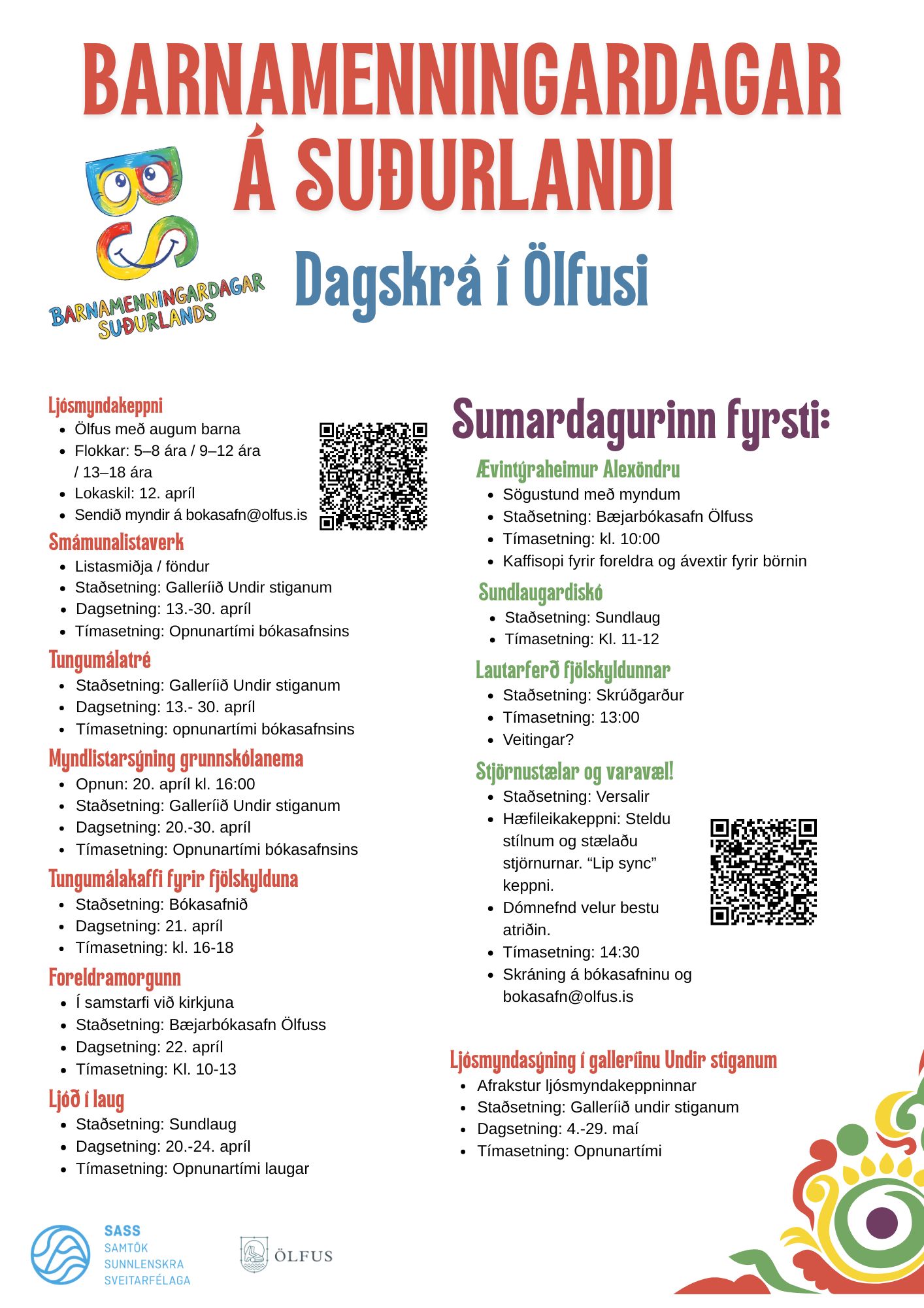 Barnamenningardagar á Suðurlandi verða haldnir með glæsilegri dagskrá í Ölfusi dagana 20.–23. apríl, en hátíðin er samstarfsverkefni Sambands sunnlenskra sveitarfélaga (SASS) og sveitarfélaga á svæðinu.