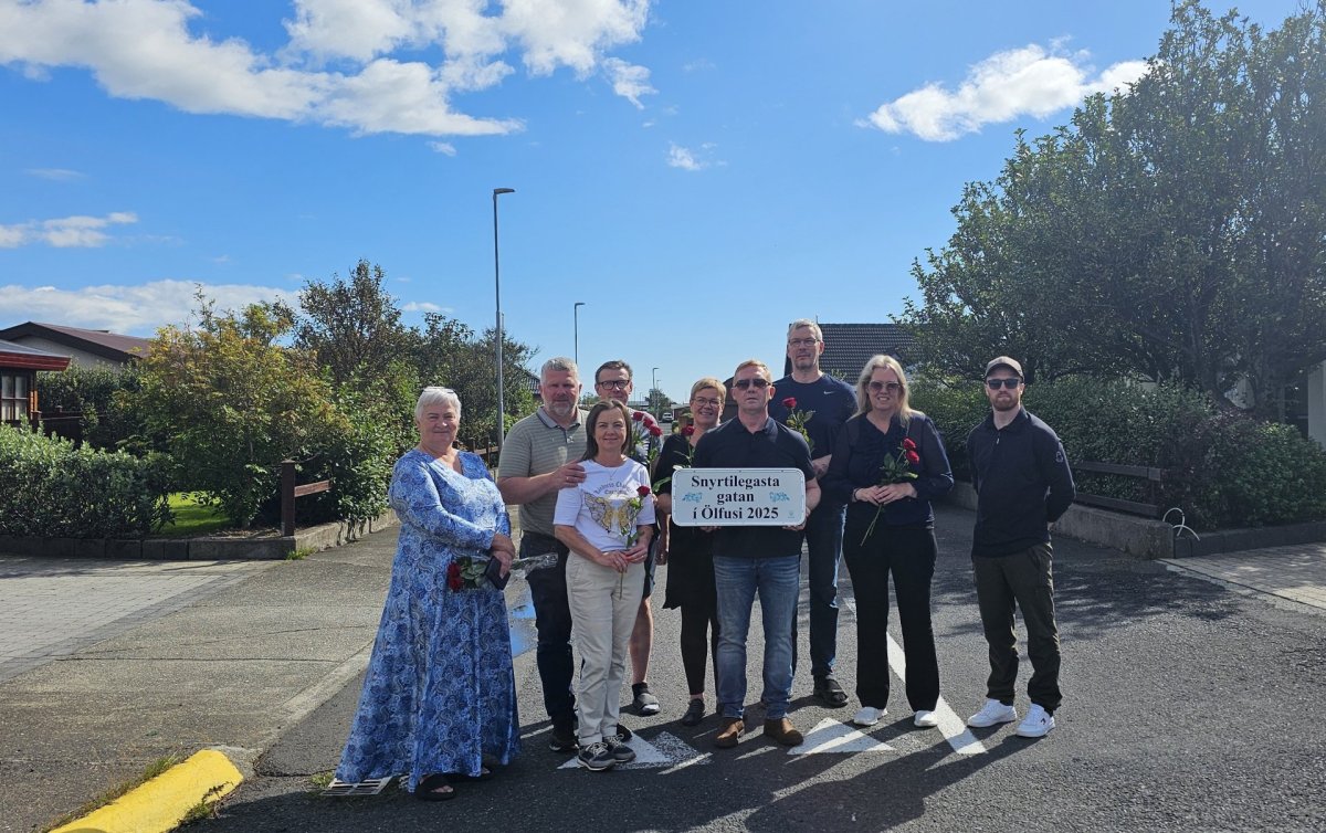 Á myndinni eru íbúar götunnar sem voru heima með fulltrúum umhverfisnefndar Hrönn Guðmundsdóttur og Hirti Ragnarssyni. Frá vinstri Bettý Grímsdóttir, Árni Hrannar Arngrímsson, Marian Stanislaw Barzowski, Guðni Birgisson, Ingigerður Eyglóardóttir, Ragnhildur Þorsteinsdóttir og Gauti Guðlaugsson. Á myndina vantar Guðbjörgu Kjartansdóttur, Markús Haraldsson, Jóhannes Magna Magneuson og Anettu Sigdísi Kristinsdóttur.