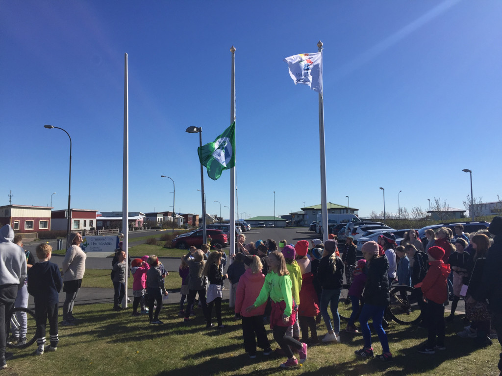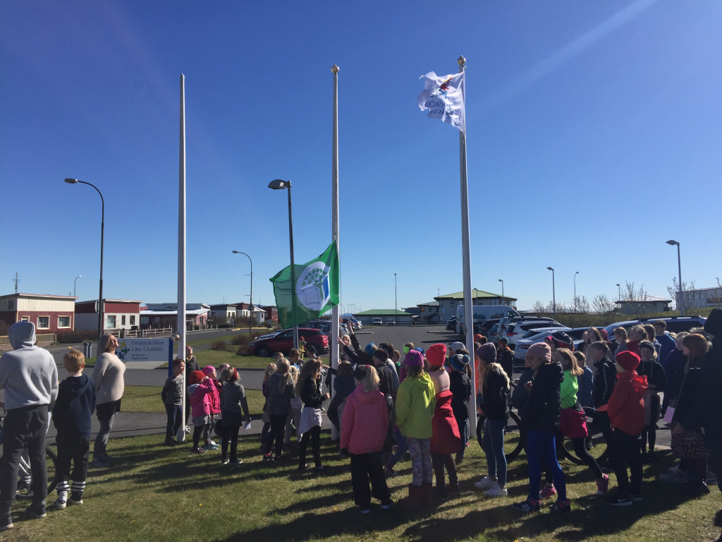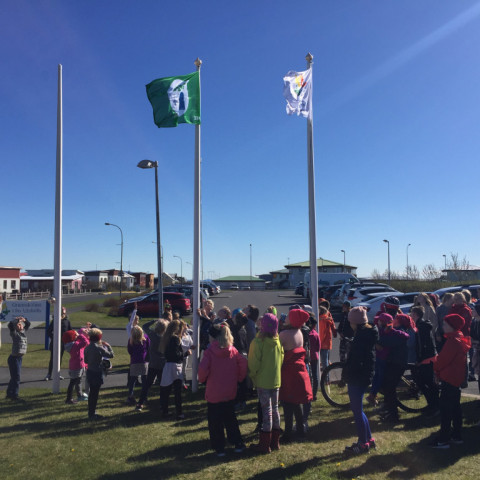 Grunnskólinn í Þorlákshöfn fékk afhentan Grænfánann frá Margréti Hugadóttur fulltrúa frá Landvernd. Afhendingin fór fram við hátíðlega athöfn í blíðskaparveðri í morgun. Umhverfisnefnd skólans með Önnu Margréti Smáradóttur grunnskólakennara í fararbroddi veitti fánanum viðtöku sem og Grænfánaskilti sem hengt verður upp á gafl skólans. Þetta er í þriðja sinn sem fáninn er afhentur skólanum, en þó nokkur ár eru liðin frá afhendingu síðasta Grænfána. Nemendur og starfsfólk skólans er afar stolt yfir því að hafa fengið Grænfánann afhentan og líta svo á að umhverfisverkefnið sem hófst að nýju á síðasta skólaári hafi nú fengið byr undir báða vængi og geti haldið áfram að vaxa og dafna.