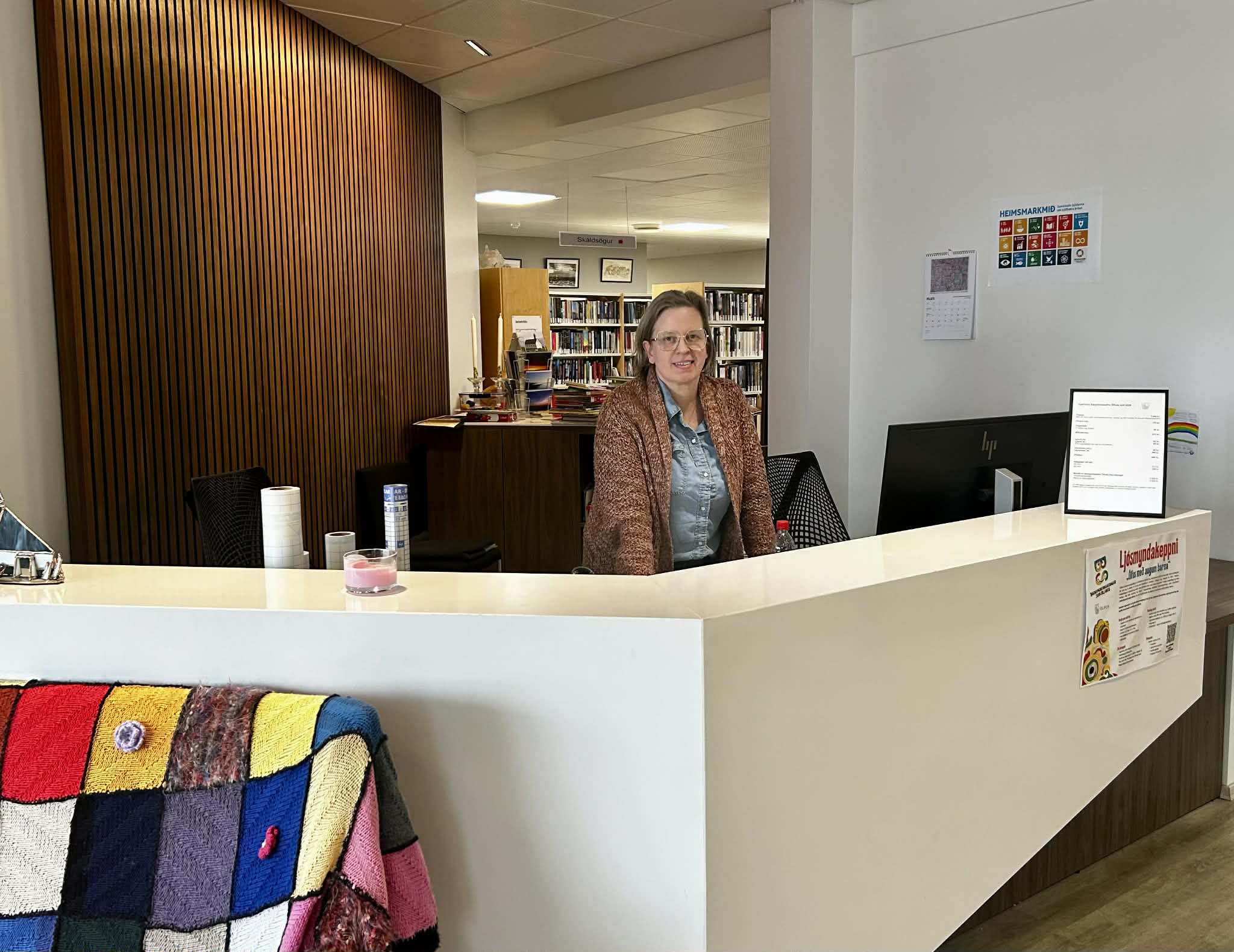 Árný Leifsdóttir forstöðumaður bókasafnsins tekur vel á móti gestum