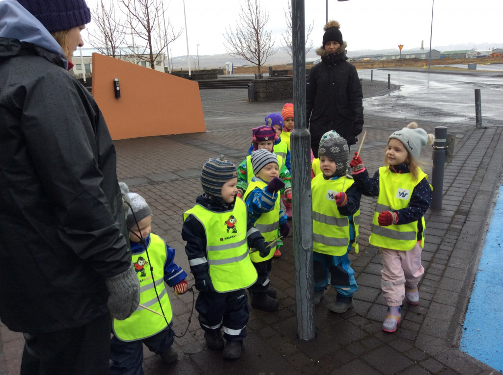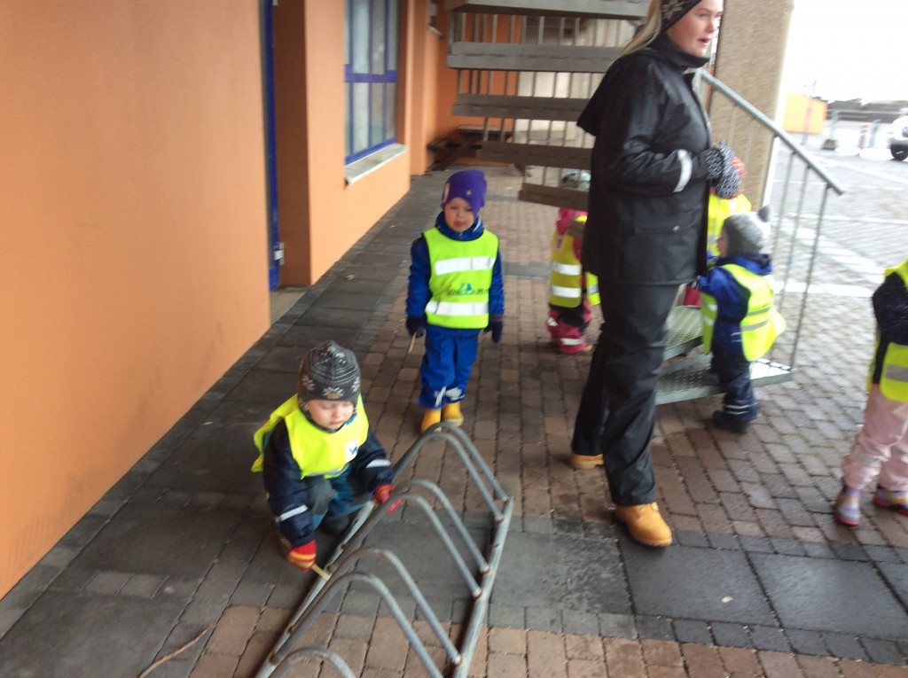 Í dag fórum við í göngutúr á bókasafnið og skiluðum bókum sem við fengum að láni í síðasta mánuði. Einnig nýttum við tækifærið og skoðuðum myndlistasýninguna "Gallerí undir stiganum". Á leiðinni til baka upp í leikskóla fengu allir kínaprjón í hendi og bönkuðu með honum í ýmislegt til að heyra hvernig hljóð kæmu/hvort það kæmu hljóð og hvort þau væru öll eins. Öll skemmtu sér vel og gaman var að sjá hvað þau höfðu mikinn áhuga á þessu :)