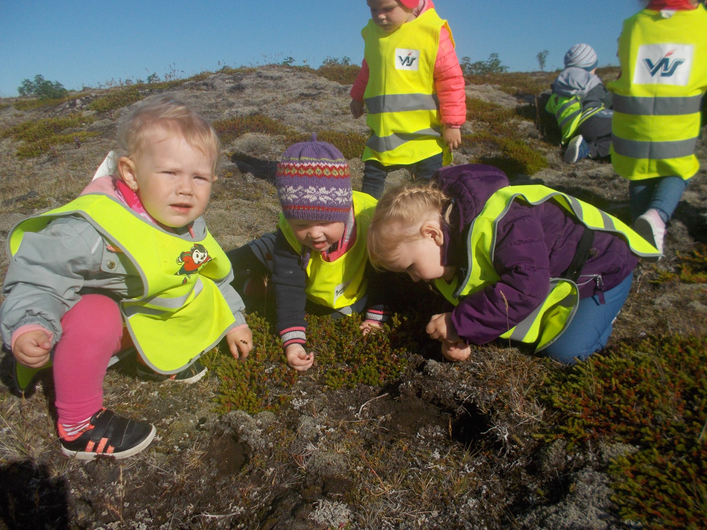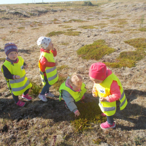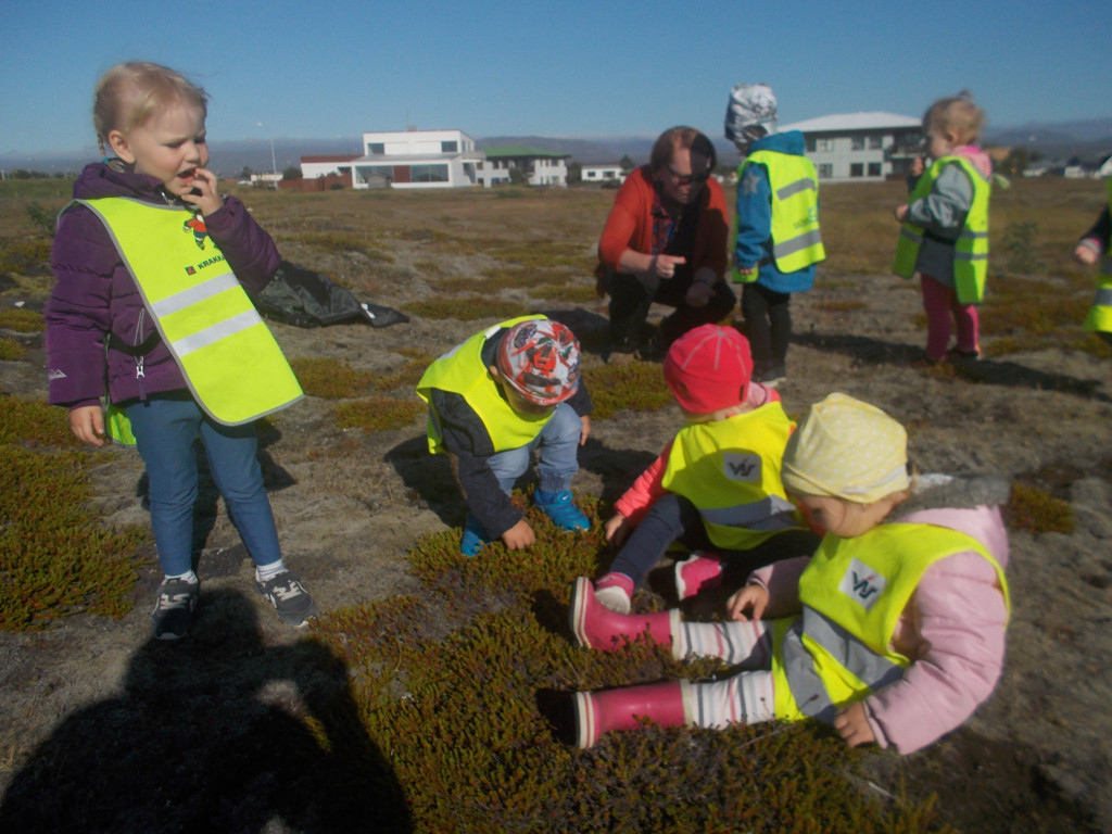 Börnin á Dvergaheimum og starfsfólk fóru í berjamó úti á Nesi. Það var sól og blíða og sóttist ferðin vel. Börnin voru mjög dugleg að ganga saman en flestum varð þónokkuð heitt þegar leið á gönguferðina. Berjasprettan var góð og við fundum fullt af góðum krækiberjum sem börnin voru dugleg að smakka. Sumir týndu beint í munninn, en aðrir vildu setja ber í vasa handa mömmu og pabba. Við vorum góða stund í móanum að týna ber og börnin nutu þess að skoða og rannsaka umhverfið sitt, fundu m.a. strá, peningablóm, rusl, lúpínufræ og svo auðvitað ber.