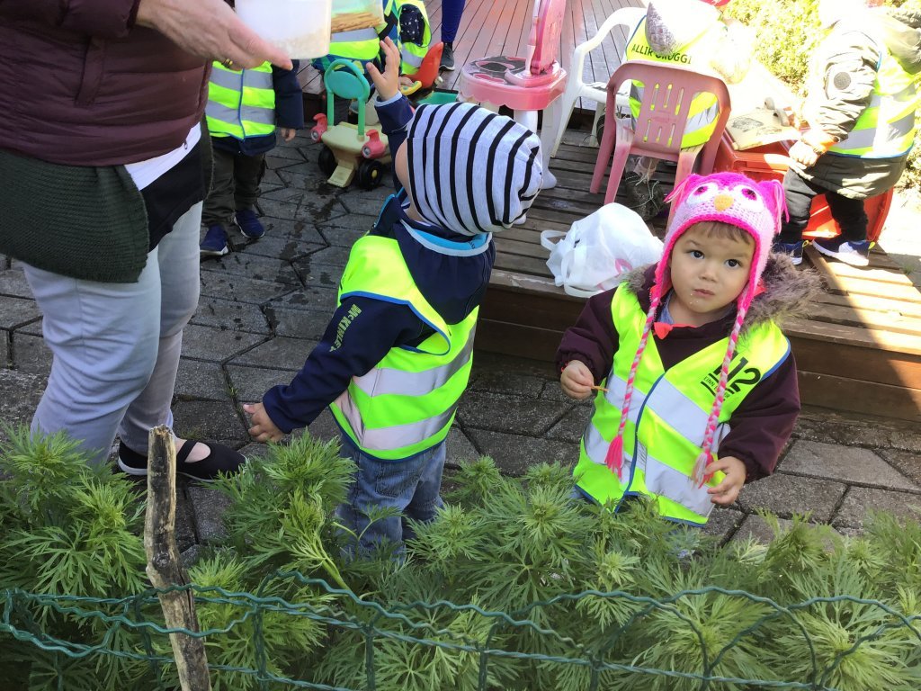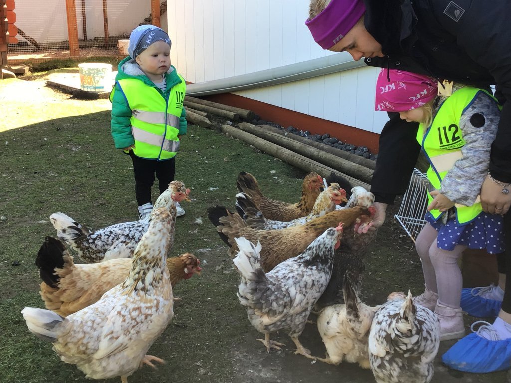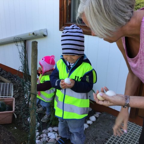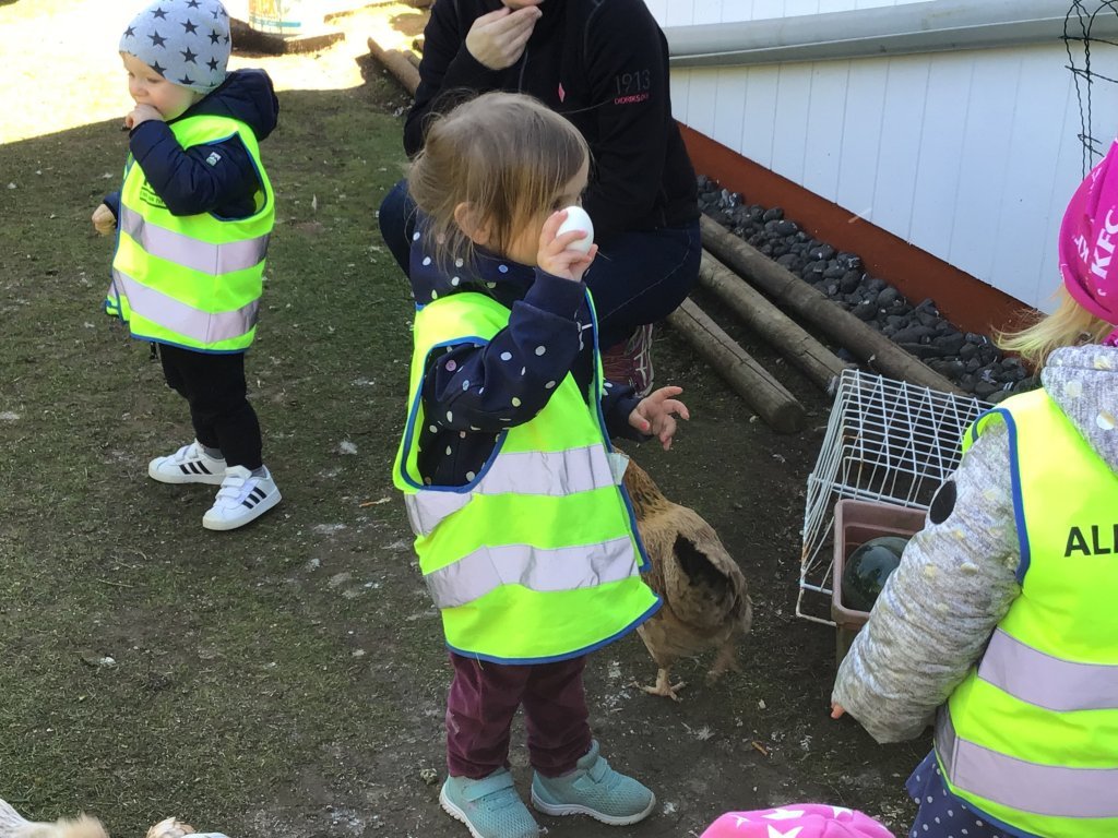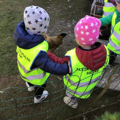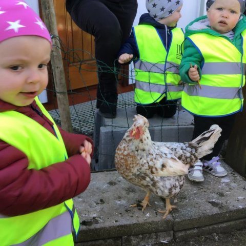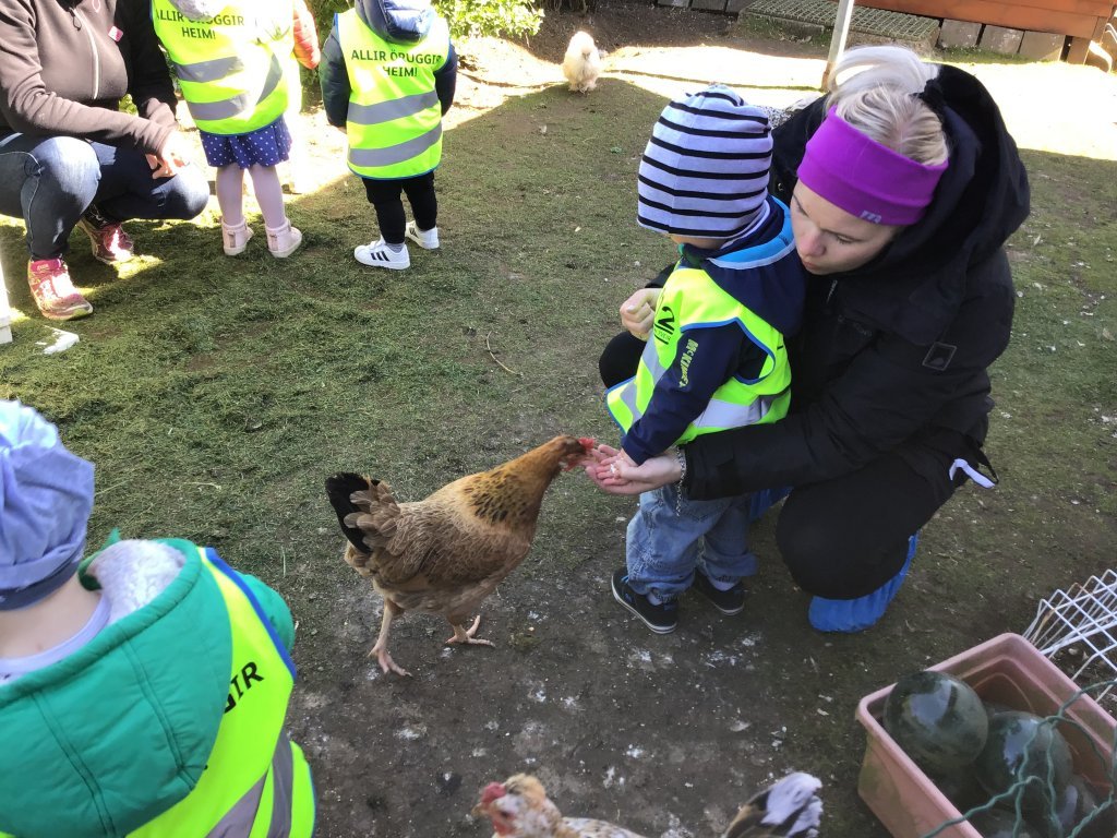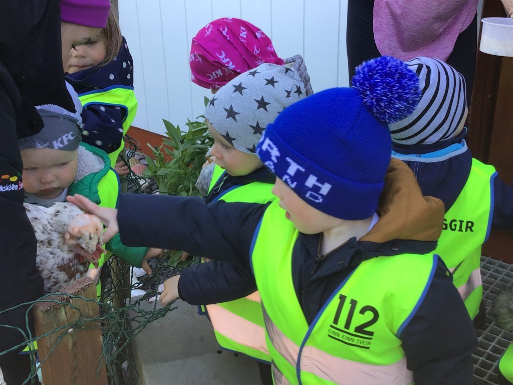 Öll börnin á Dvergaheimum fóru í gönguferð að Lýsubergi þar sem Þuríður á heima.  Við fengum að kíkja í garðinn hennar og skoða hænurnar.  Við fengum að fara inn fyrir gerðið, þ.e. þeir sem vildu, og gefa hænunum að borða og athuga hvort þær voru búnar að verpa.  Við fundum nokkur egg og eitt eggið brotnaði...úps.  Þuríður gaf börnunum korn og saltstangir sem þau máttu gefa hænunum en stundum var bara best að borða saltstangirnar sjálf.