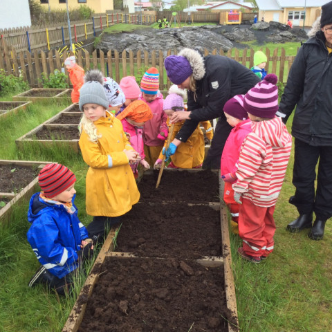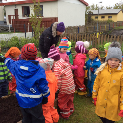 Börnin tóku upp kartöflur, gulrætur og rófur. Næstu daga eftir voru kartöflurnar hafðar í hádegismat. Börnin fengu svo að smakka á gulrótum og rófum í ávaxtastund.