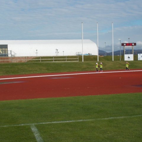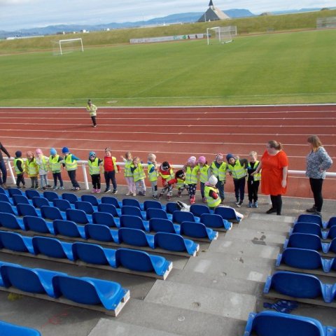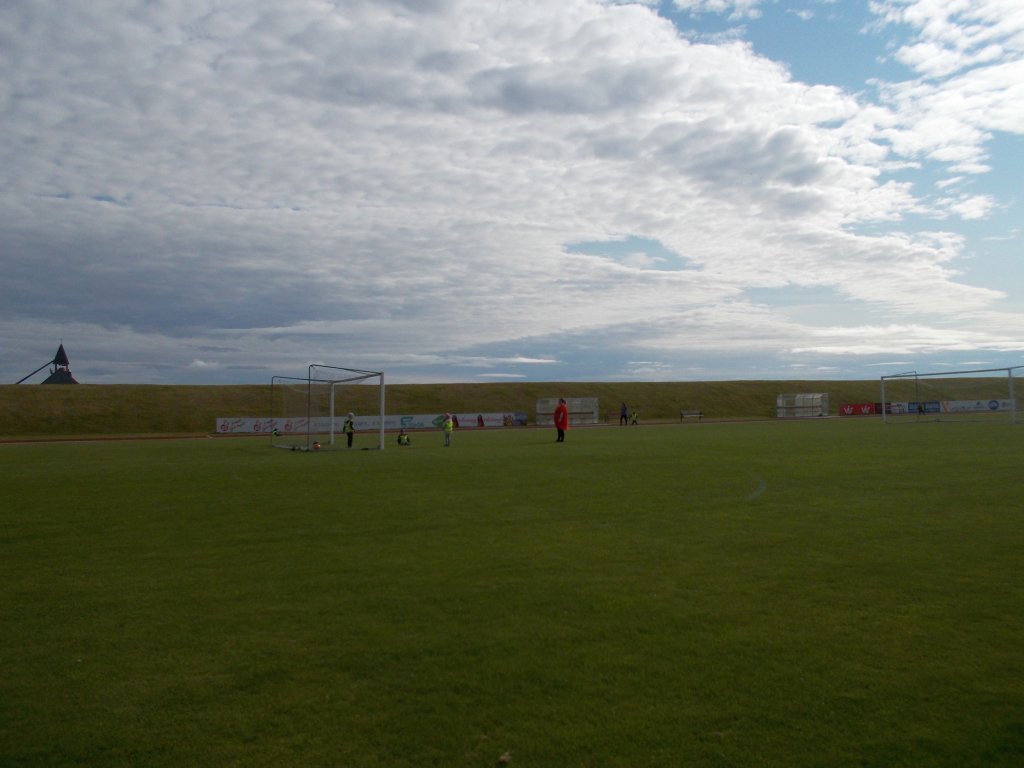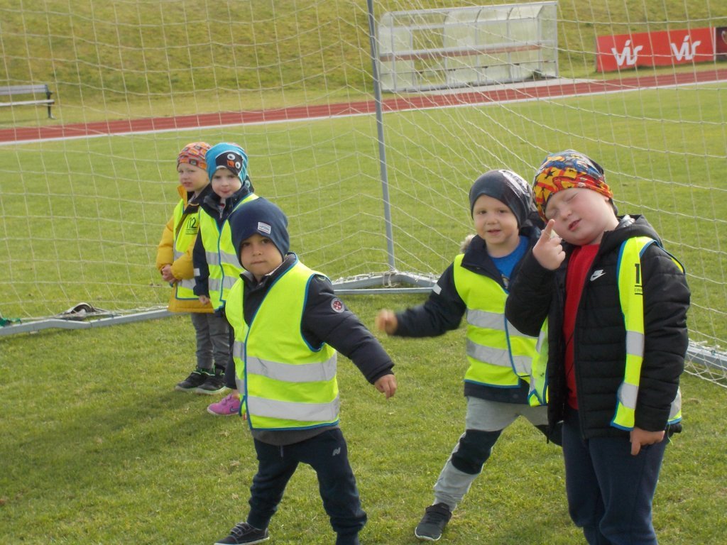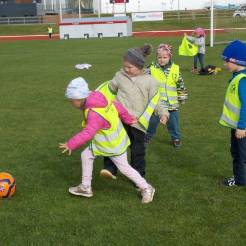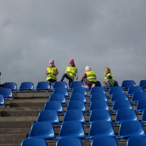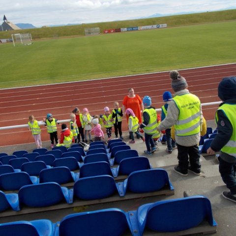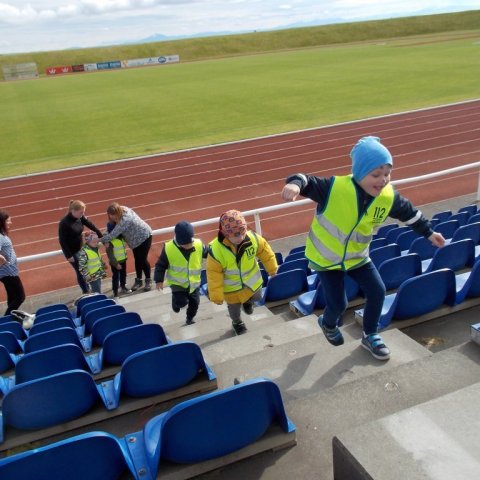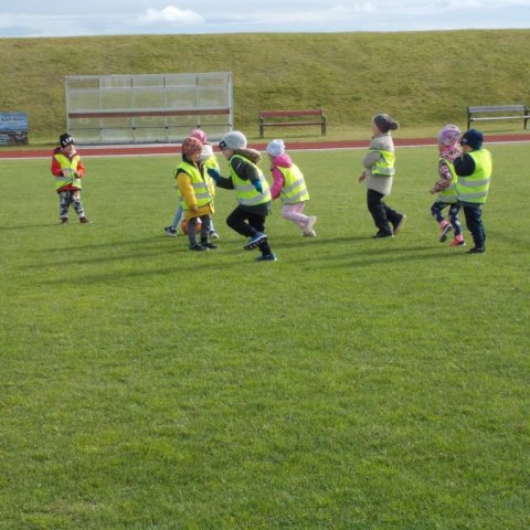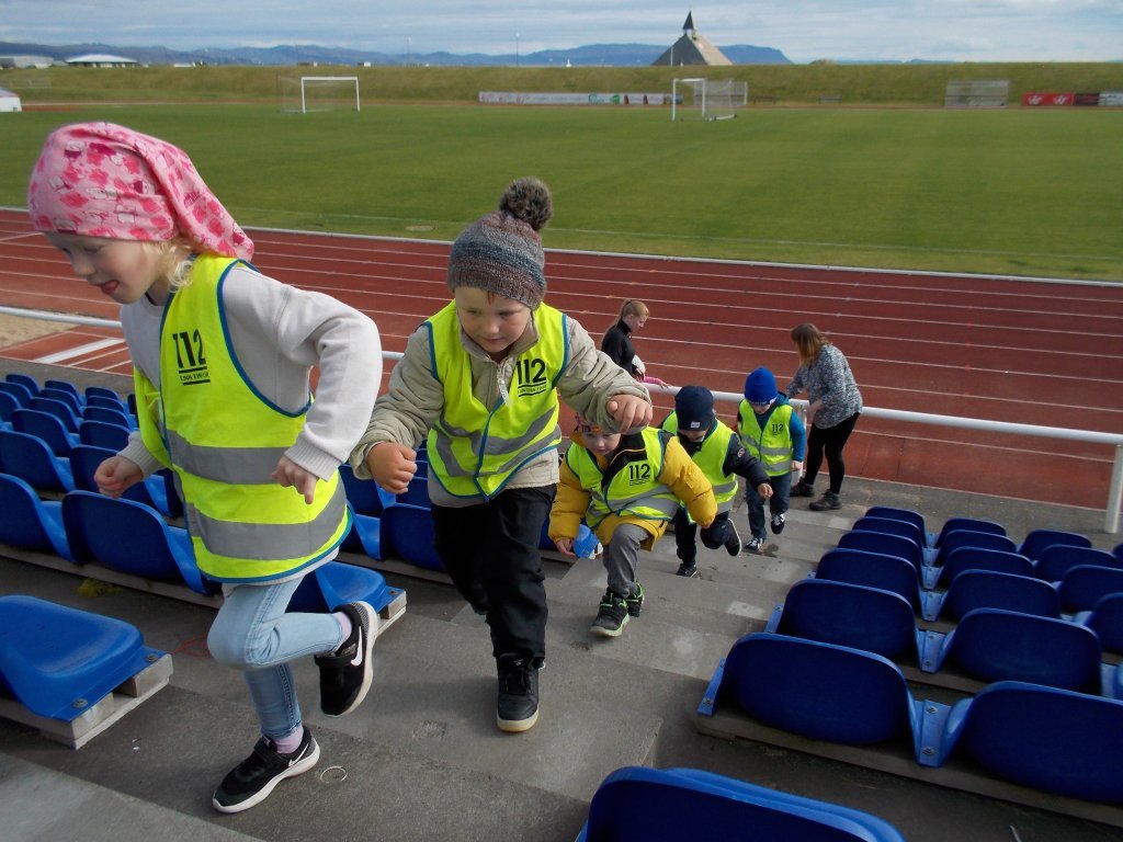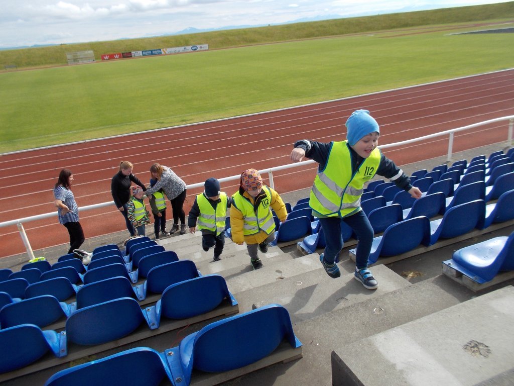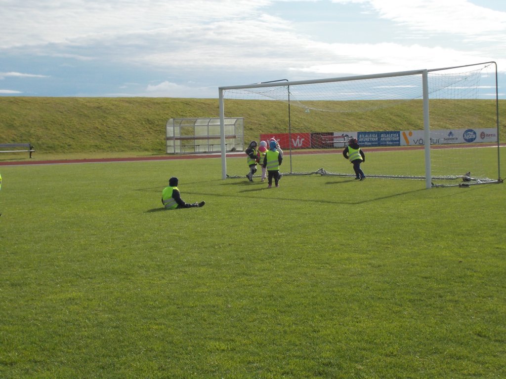Við byrjuðum á að hita upp með því að hlaupa einn hring. Eftir það fórum við í fótbolta og var mjög gaman. Við hlupum upp tröppurnar í stúkunni og niður brekkuna við hliðina á henni nokkrum sinnum og teigðum svo á í lokin.