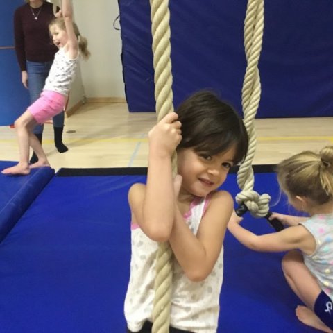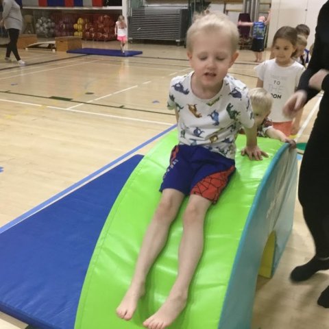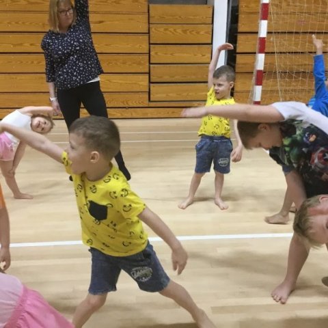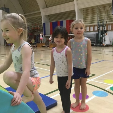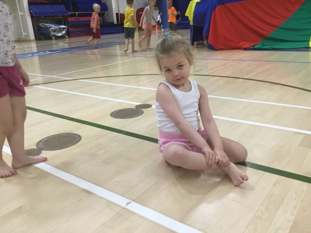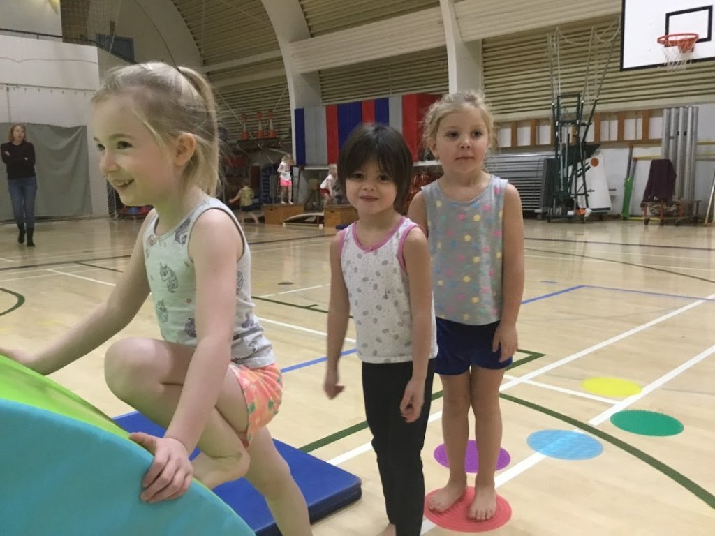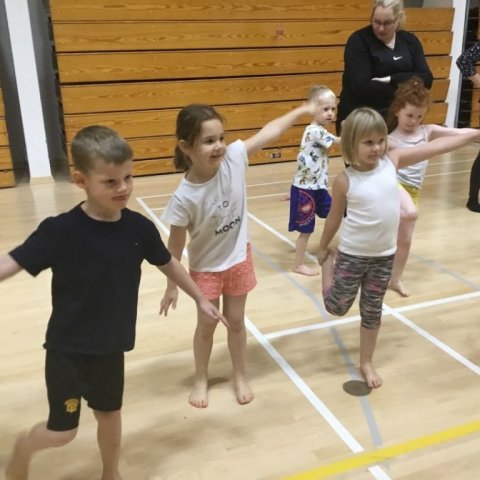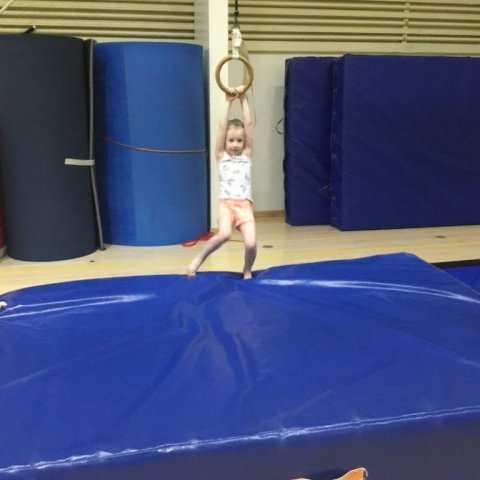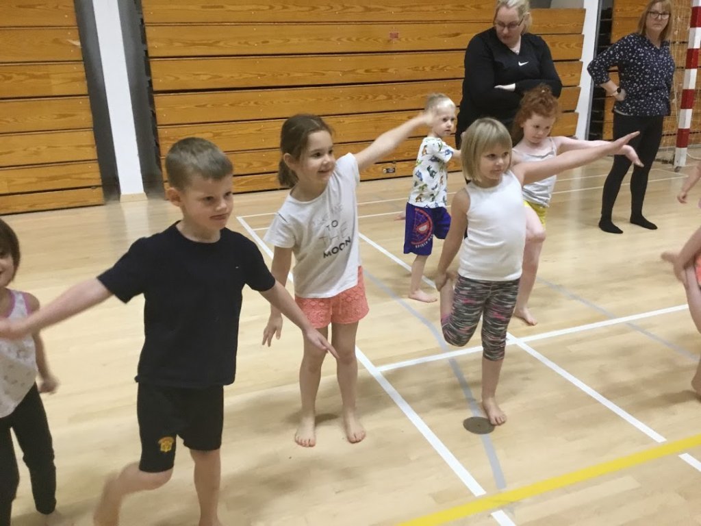 Í gær var frjáls tími í íþróttum. Þá eru settar upp stöðvar hér og þar um salinn og svo mega krakkarnir fara í það sem þau vilja.